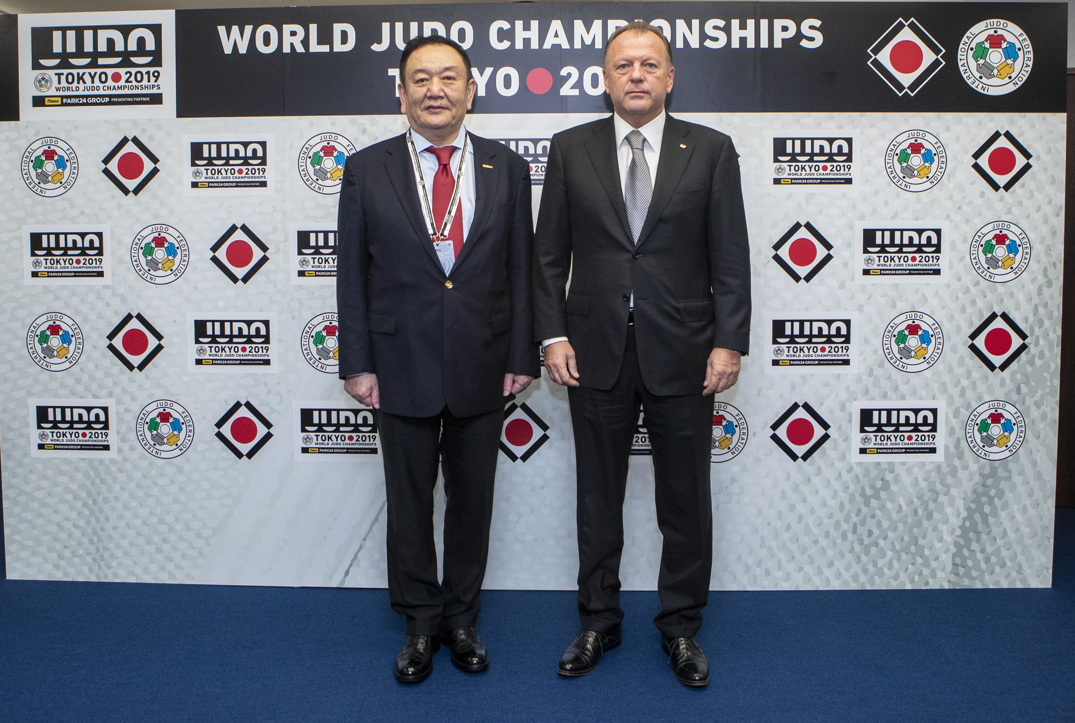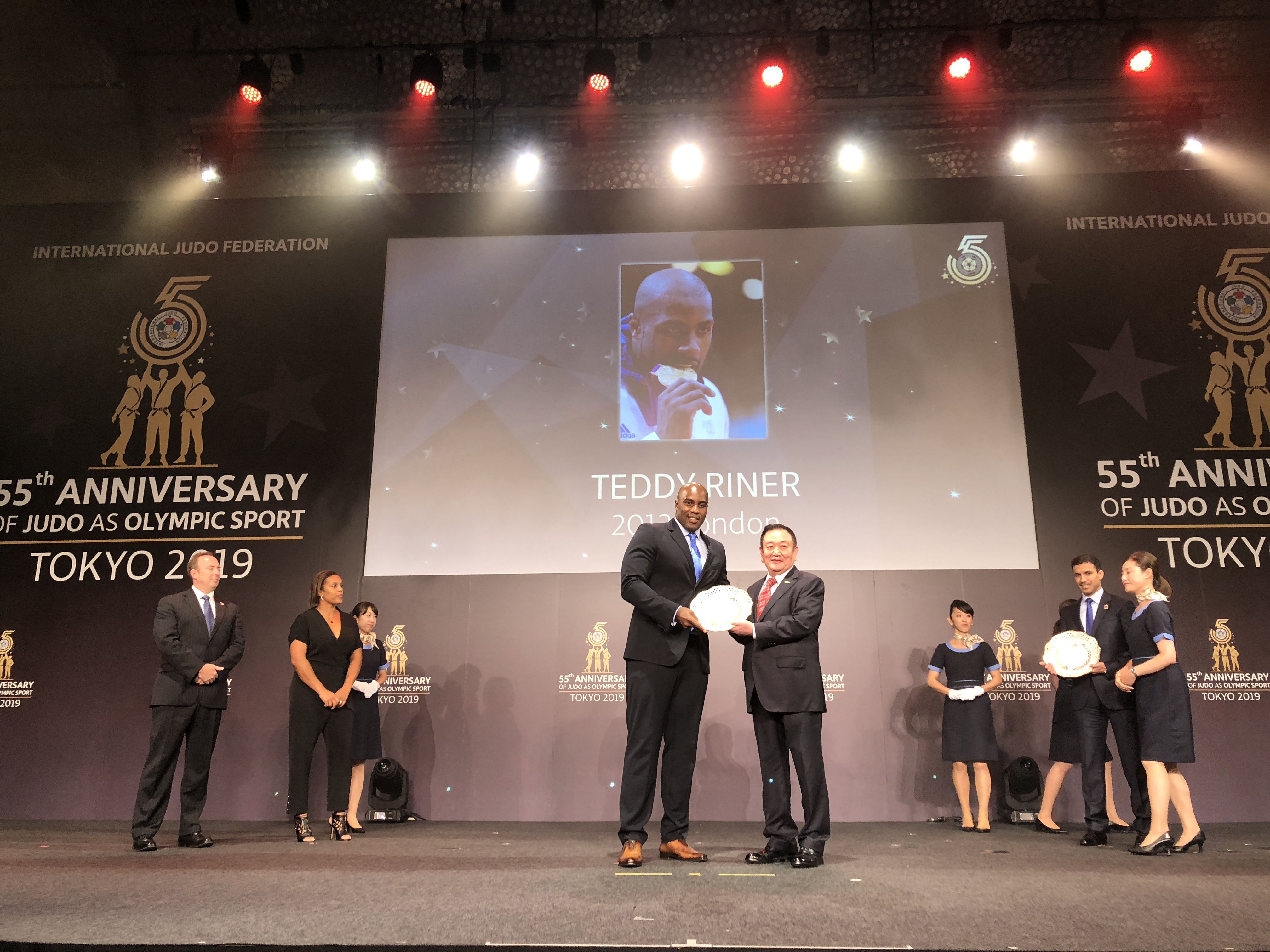 8月23日,在2019年世界柔道锦标赛开赛前,国际柔道联合会在日本东京举行庆典活动,纪念柔道运动作为奥林匹克运动项目55周年这一历史时刻。仪式上,国际柔道联合会将近60年来为世界柔道运动做出贡献的运动员与组织机构颁发奖项。星空·综合体育产业集团作为国际柔道联合会顶级合作伙伴受邀出席,董事长卞志良作为特邀嘉宾为伦敦奥运会最佳男运动员Mr. Teddy Riner,伦敦奥运会最佳女运动员Mrs. Lucie Decosse 颁奖。