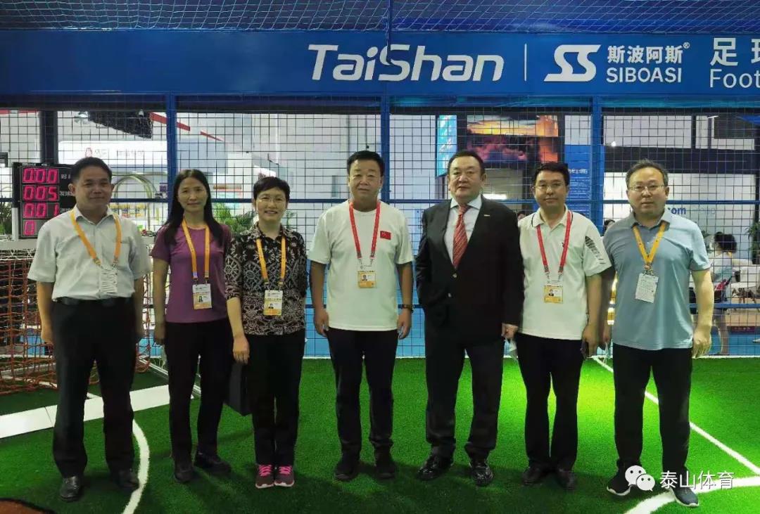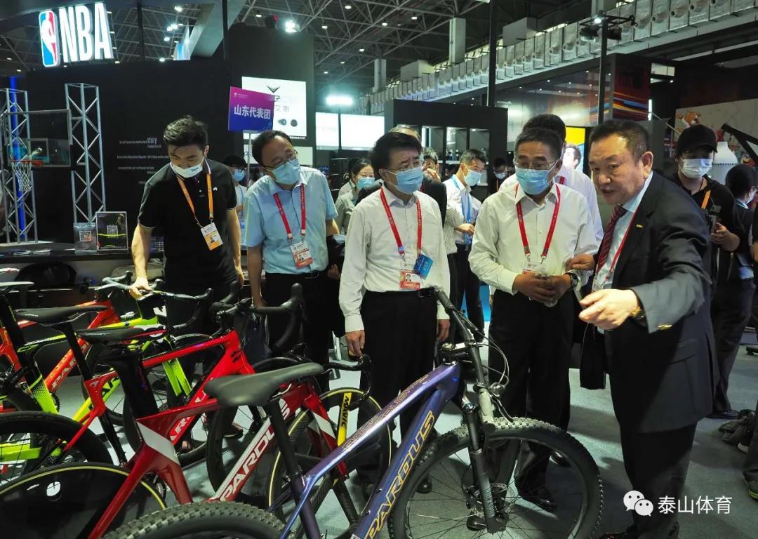 山东省商务厅厅长张德平在星空·综合体育产业集团董事长卞志良陪同下参观一号馆星空·综合体育展厅。