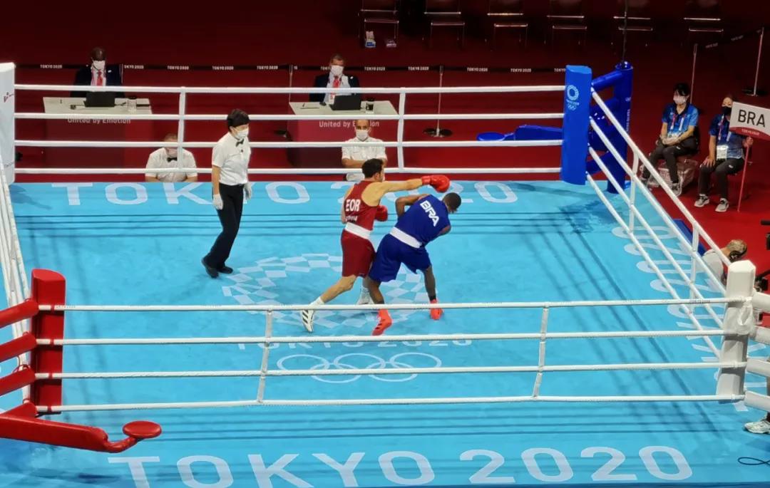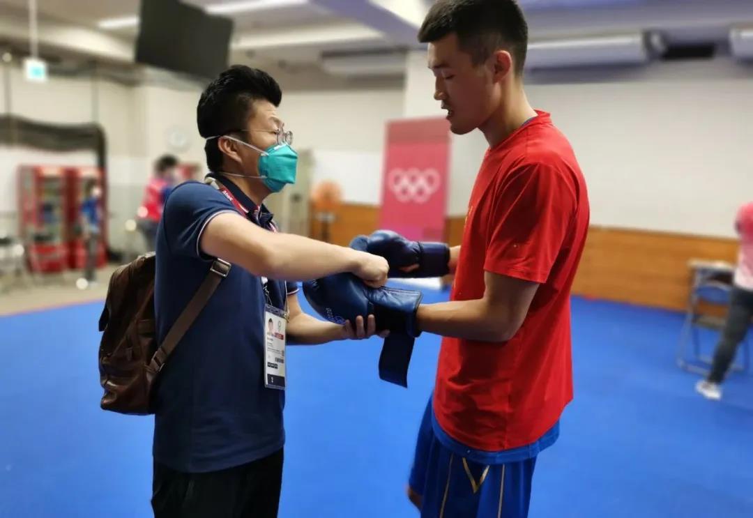东京奥运会拳击热身馆,星空·综合体育工作人员帮助运动员穿戴拳击手套